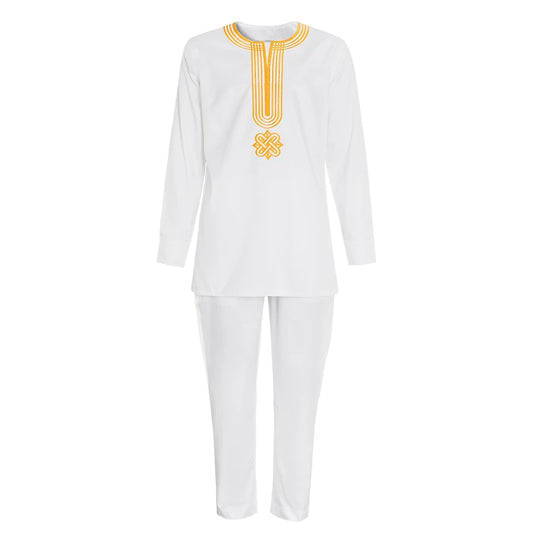 New African Clothes for Men Dashiki Tradition Outfit Robe Embroidery White Tops Pants Suits Bazin Muslim Wedding Party Clothing