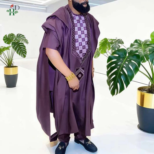 H&D African For Men Traditional 3PCS Outfit Thobe Set Purple Agbada Embroidered Robe Plus Size Wedding Christmas BouBou Ramadan