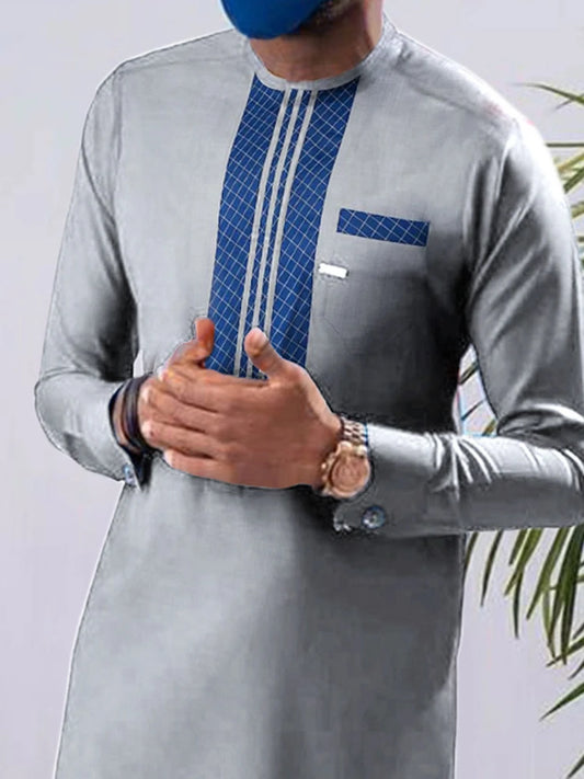 Top Men Muslim Shirt Long Sleeved Blouse Patchwork Round Collar Casual Morocco Dubai Arab Islam Summer Shirts Kaftan Hombre