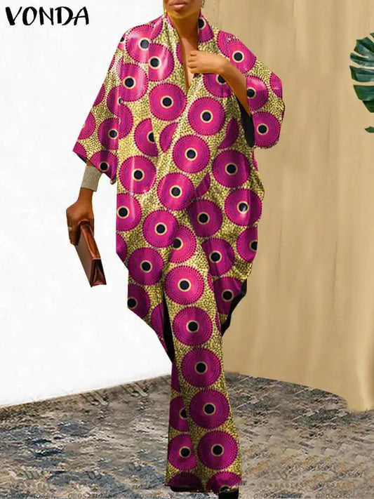 VONDA Plus Size Women Elegant Wide Leg Pants Pants Sets 2024 Vintage 3/4 Sleeve Elastic Waist Tops+Trousers Casual Pleated Suits