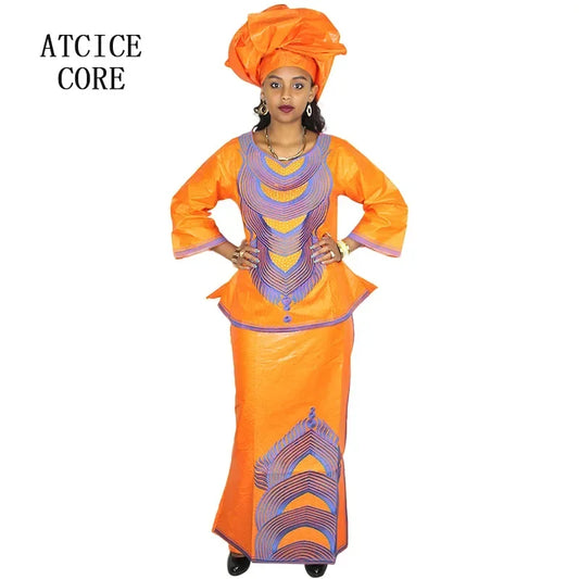 New Nigerian Original Bazin Dress Dashiki Brocade Embroiderey Basin Clothing 2022 Orange Mali Women Robe Wedding Party Dresses