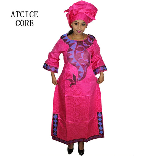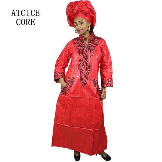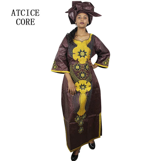 African Dresses For Woman Bazin Riche Embroidery Desing Long Dress With Scarf 2 Piece Set