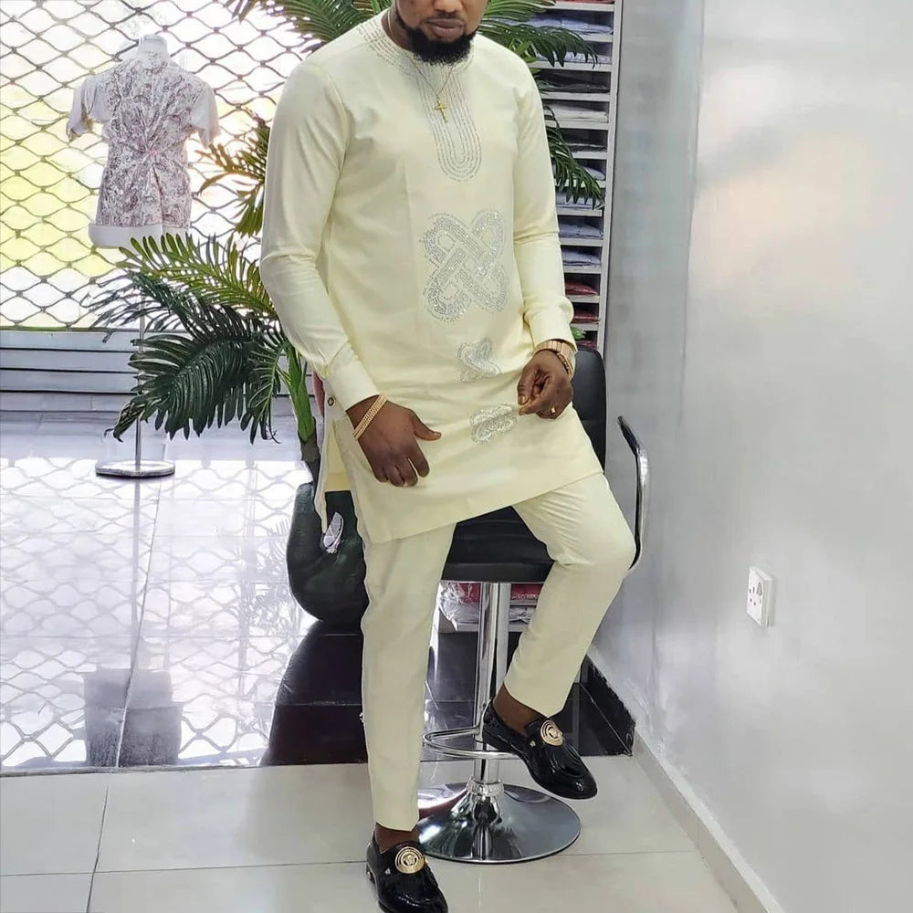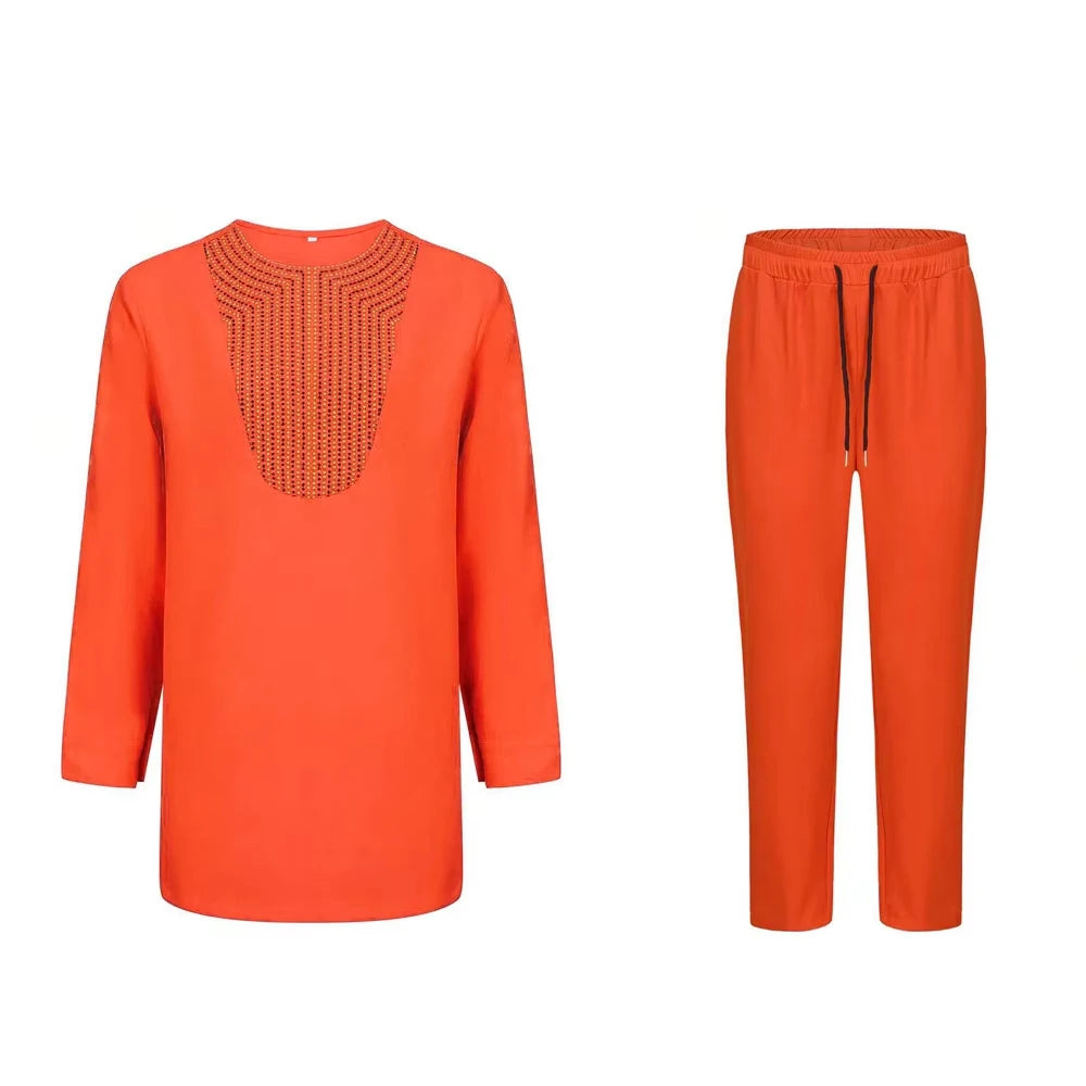 2026 Men's Elegant Long Sleeve Suit Shirt Pants 2-piece Round Neck Stitching Solid Color Party Long Sleeve African Ethnic Style