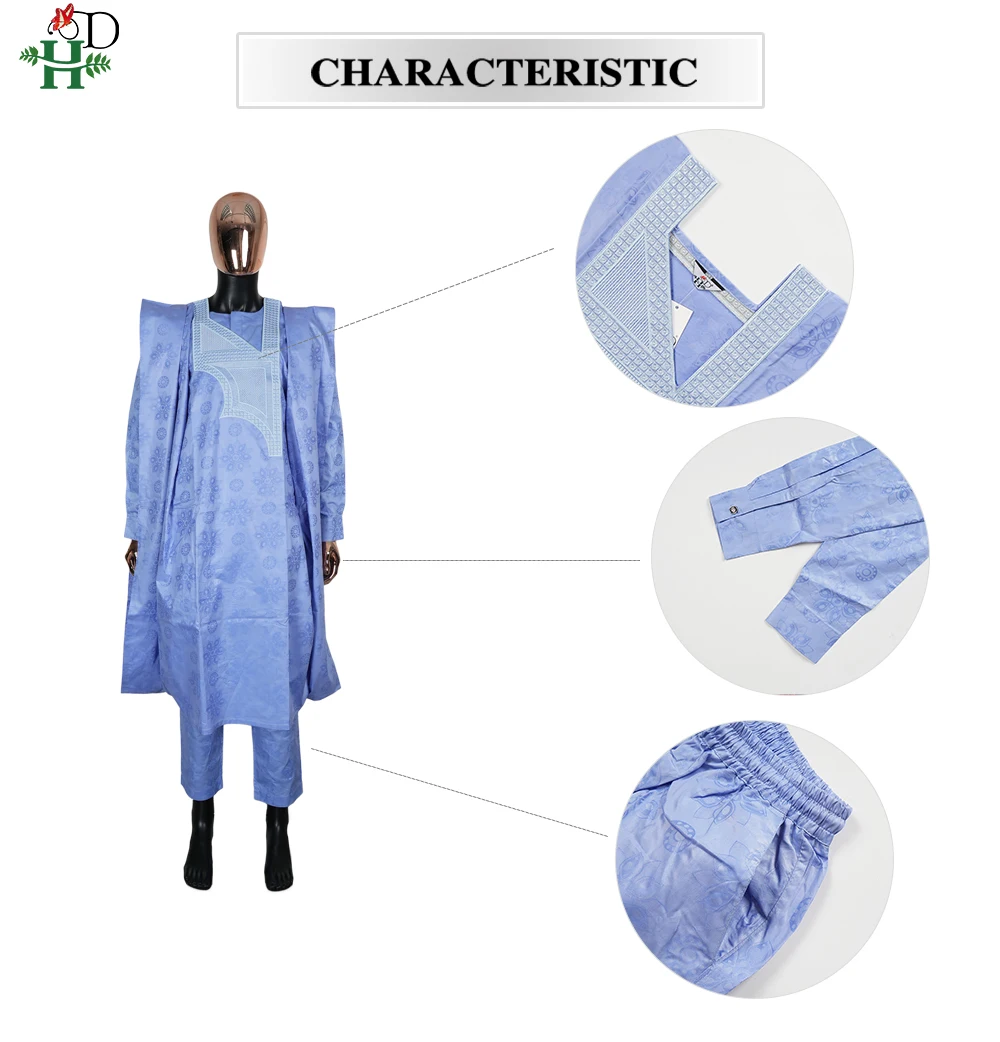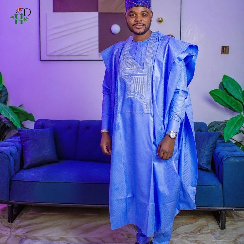 African Clothes Embroidery Blue Gown Plus Size For Men Elegant Party Wedding Thobe 3 PC Top and Pants Suits Set Daily Wear 2025