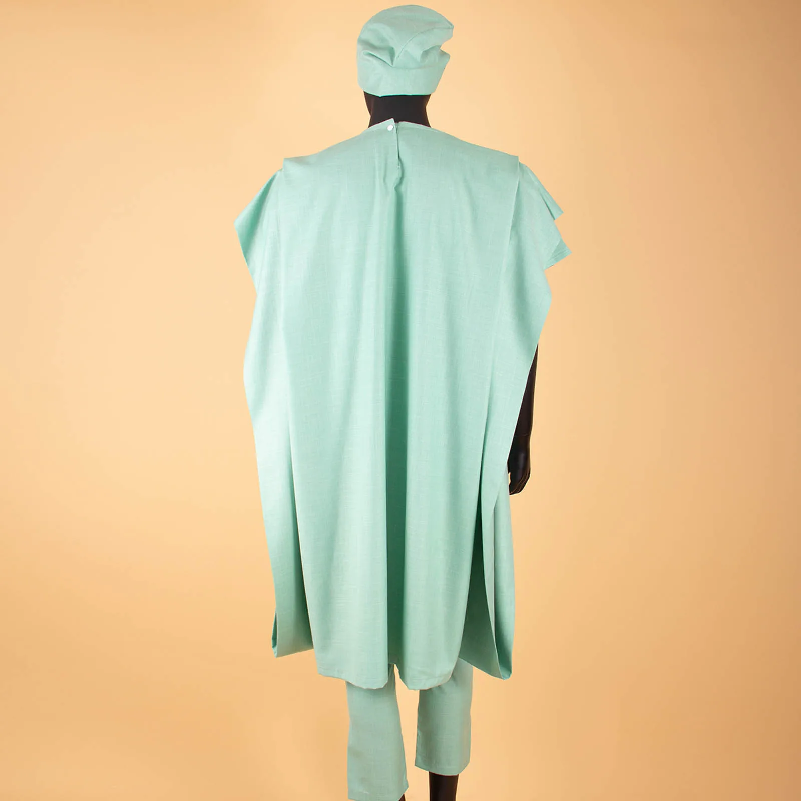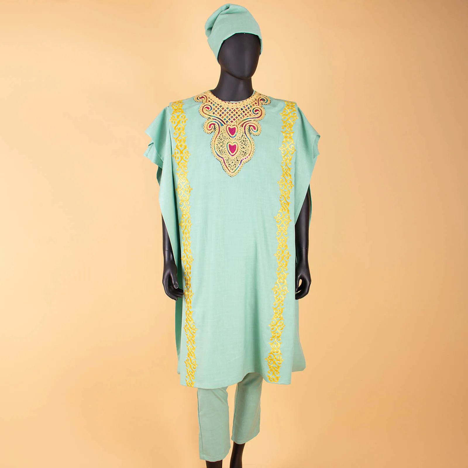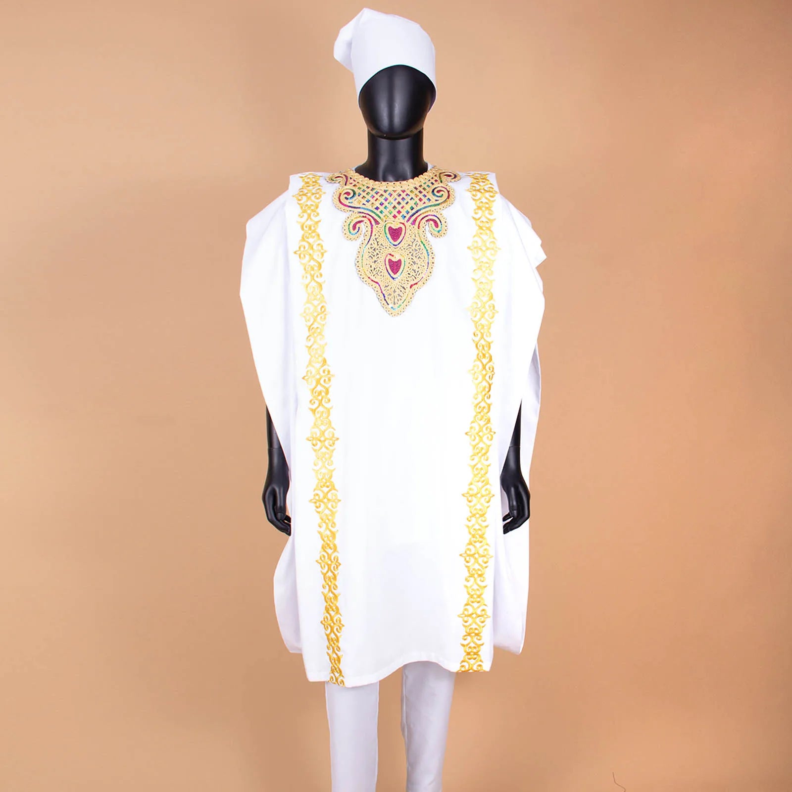 This distinguished four-piece ensemble showcases authentic African craftsmanship, featuring a traditional agbada shirt paired with coordinating pants and hat. Meticulously constructed from 100% premium cotton with intricate wax and batik embroidery detailing, the set delivers both cultural authenticity and refined elegance. The shirt boasts a classic o-neck design with functional pockets and full lining, while the pants feature a secure zipper closure and full-length cut. Short sleeves and standard weight fabric ensure comfort across spring and summer occasions. Ideal for weddings, evening celebrations, and formal gatherings, this versatile collection honors heritage while maintaining contemporary sophistication. Available for private customization to suit your specific preferences.