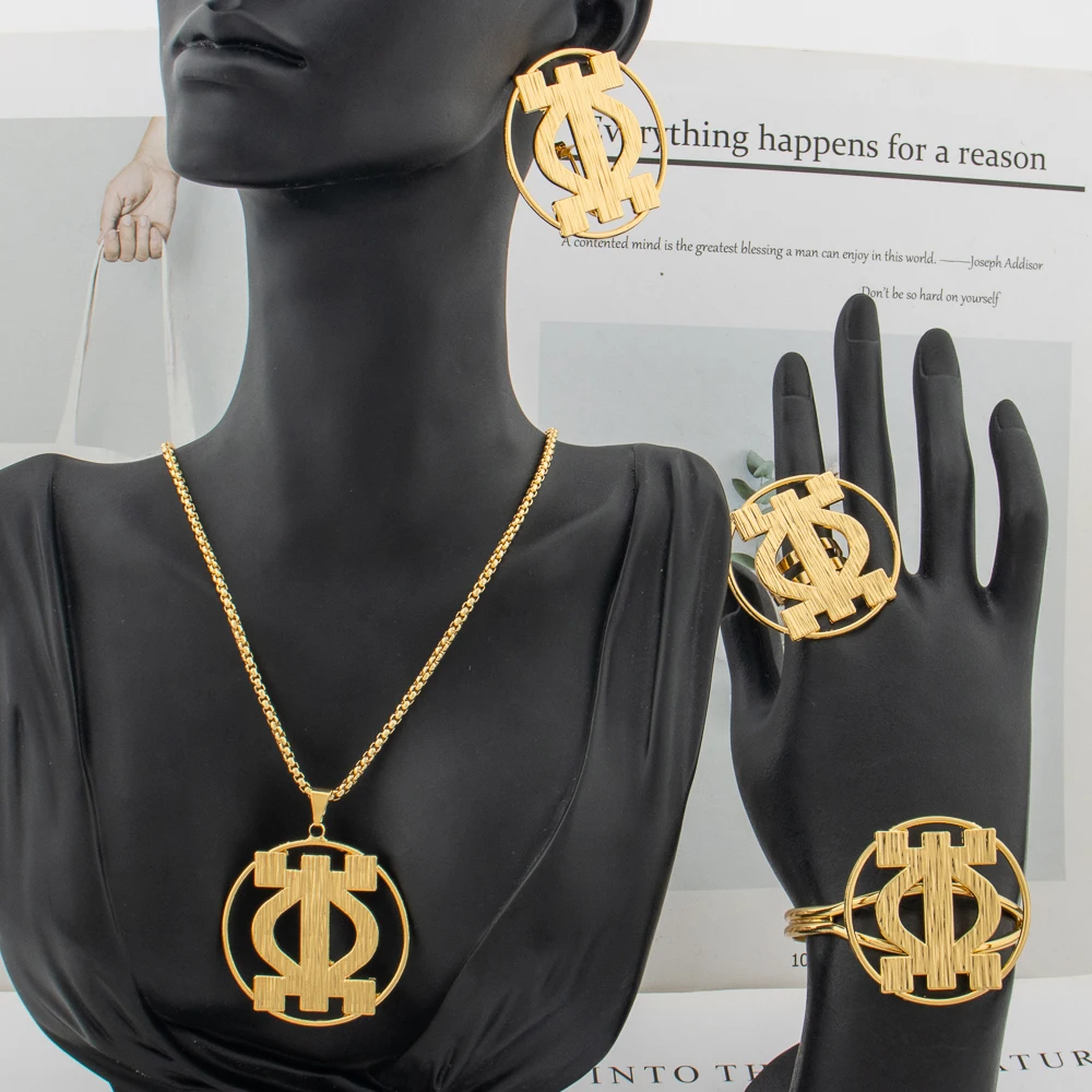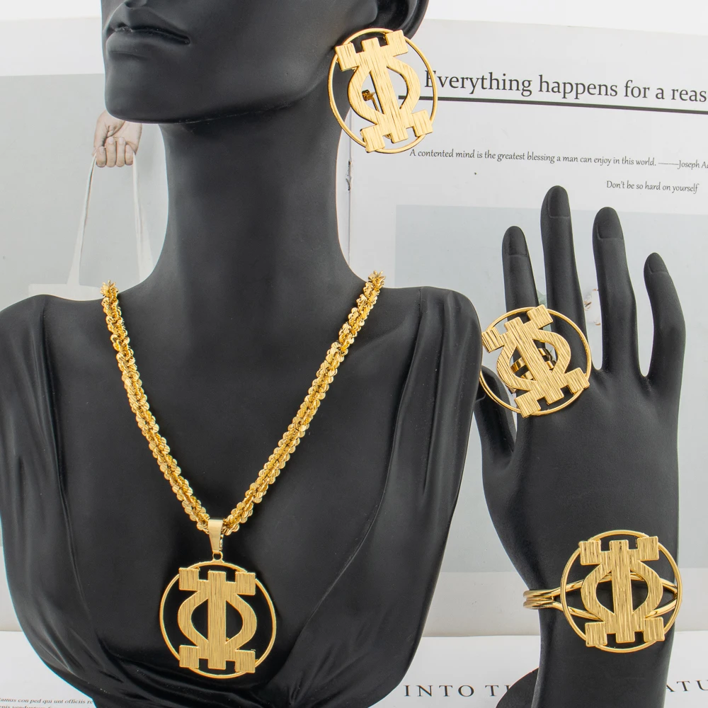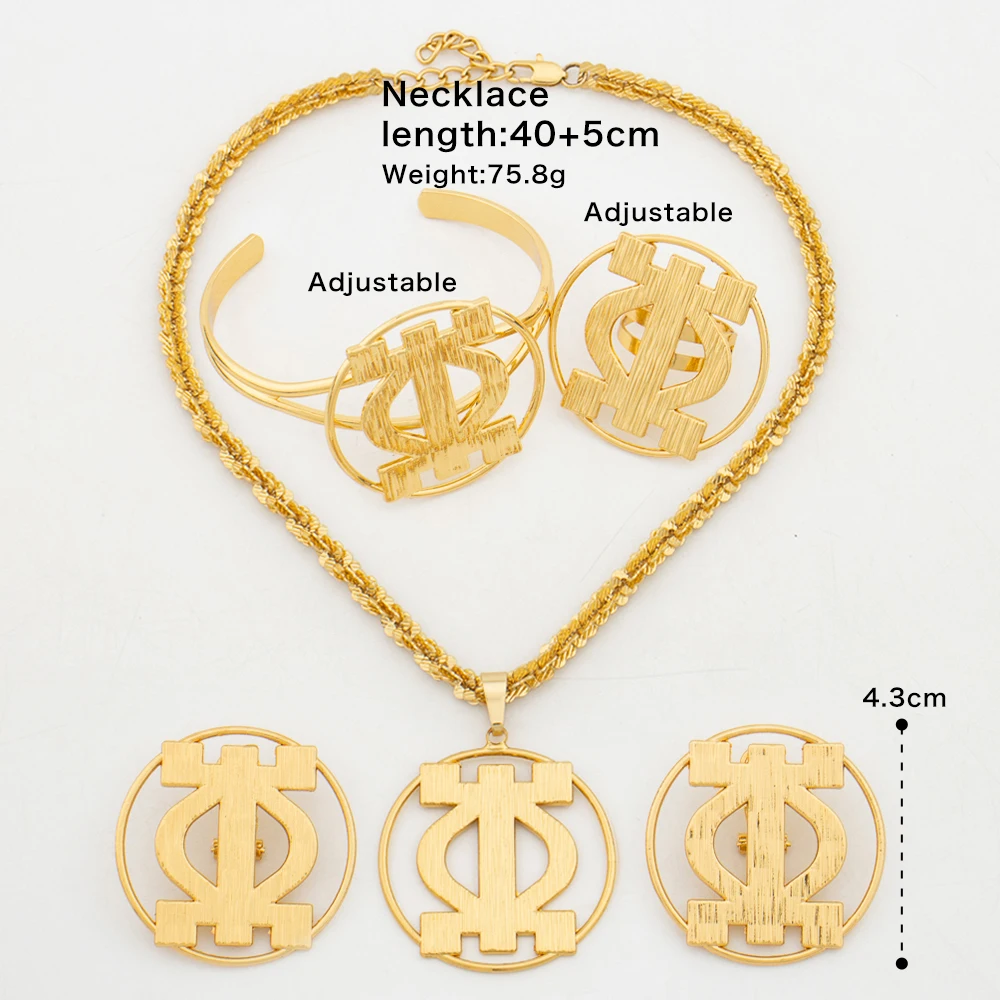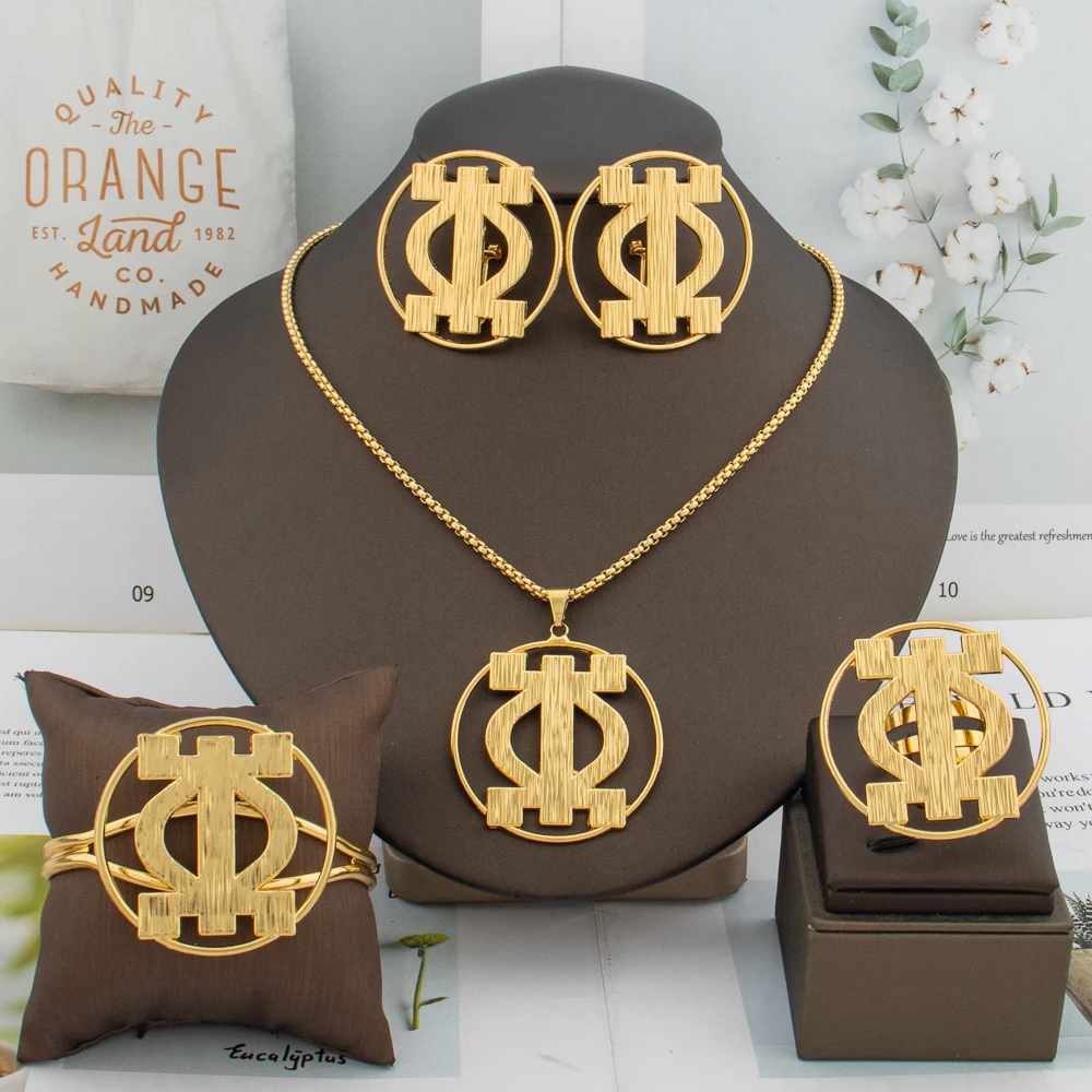 African Women Elegant Gold Color Clip Earrings Round Bracelet Design Irregular Hollow Earrings Necklace 4PCS Party Jewelry Gift