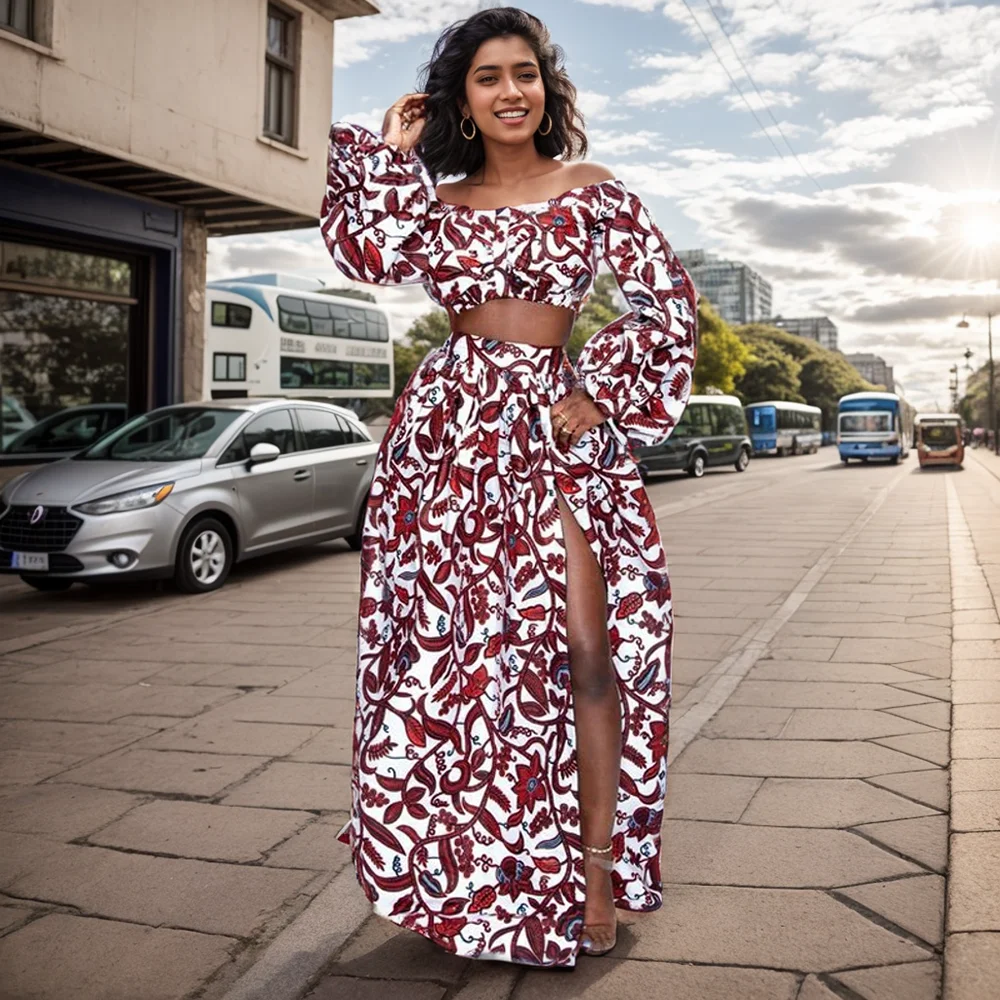 Elegant Women Two Piece Set Dress Sexy Slash-neck Sleeveless Blouse Top +High Slit Skirt Vintage Africa National Print Lady Suit