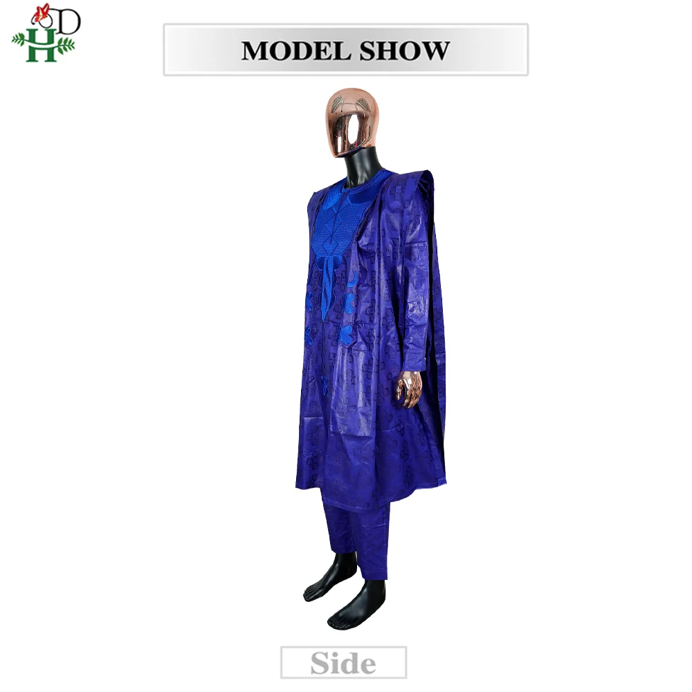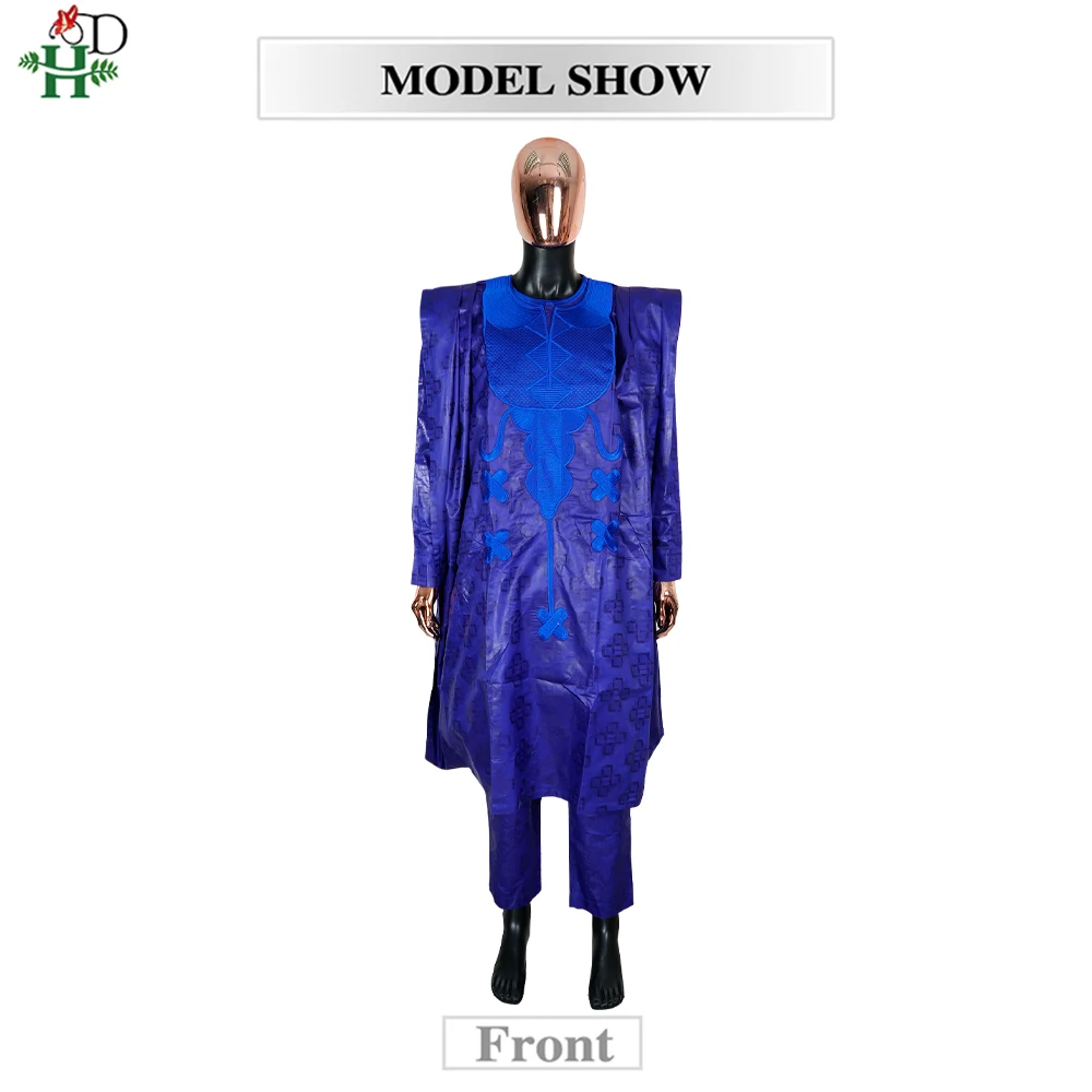H&D African Clothing Traditional 3PCS African Outfit For Man Blue Bazin Riche Agbada Embroidered Wedding Party Robe Plus Size