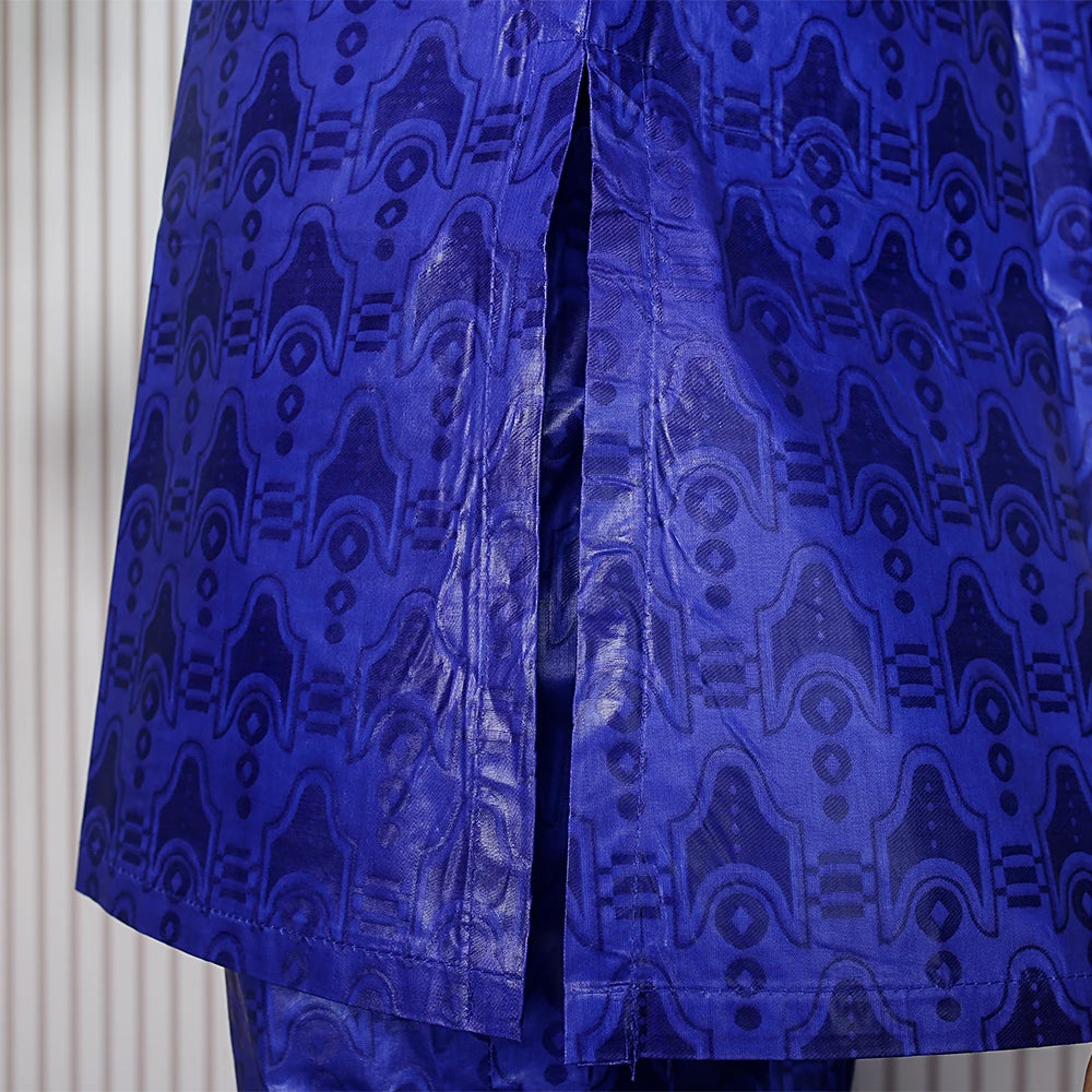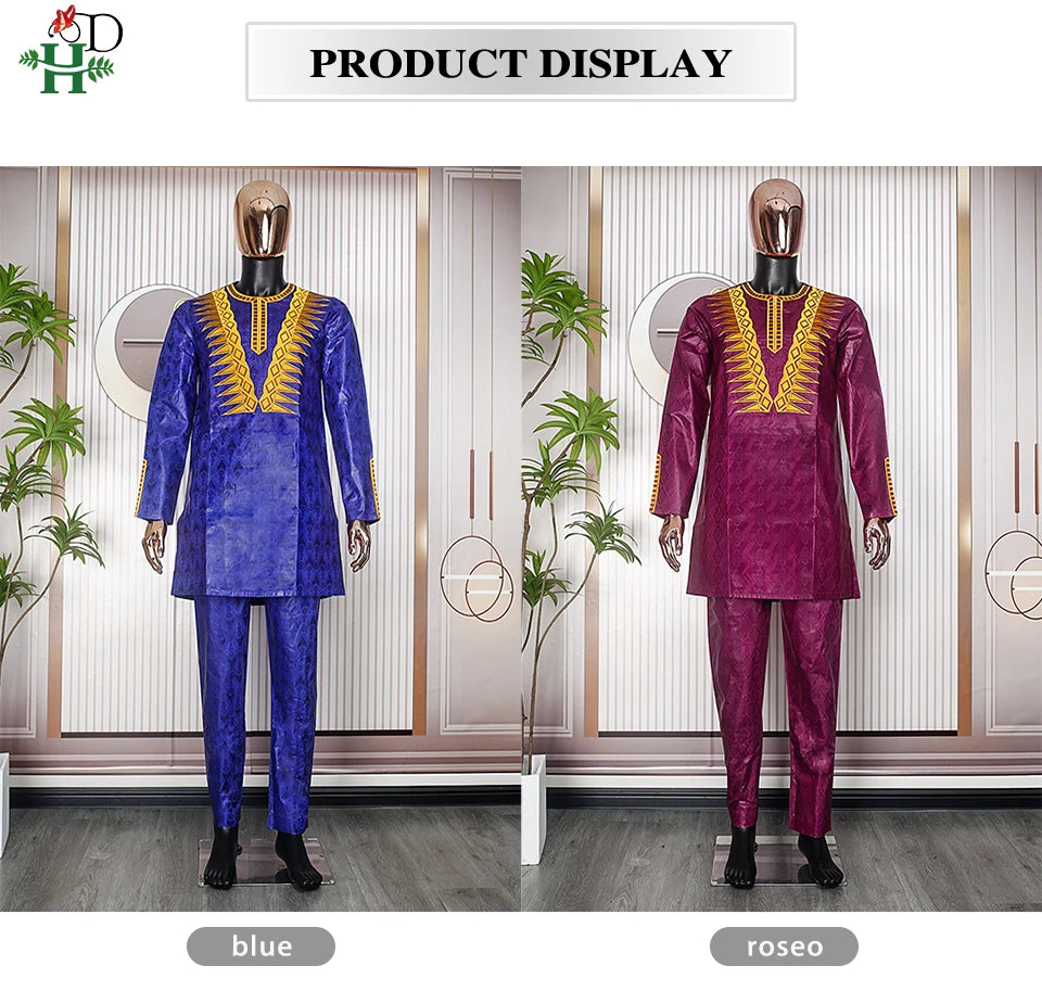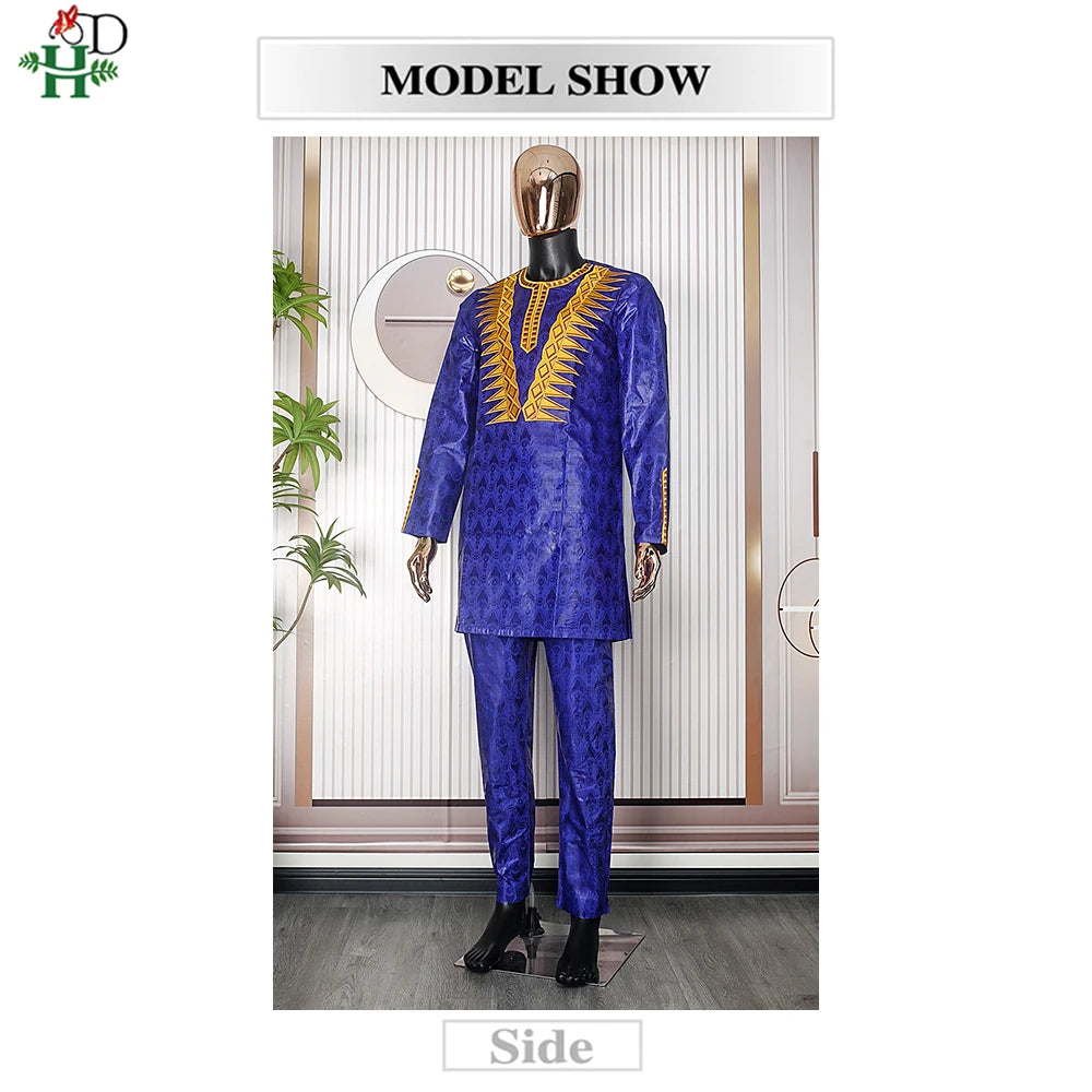 H&D New African Clothes for Men Tradition Clothing Embroidery Blue 2 Pcs Set Top Pant Bazin Muslim Wedding Party Dashiki