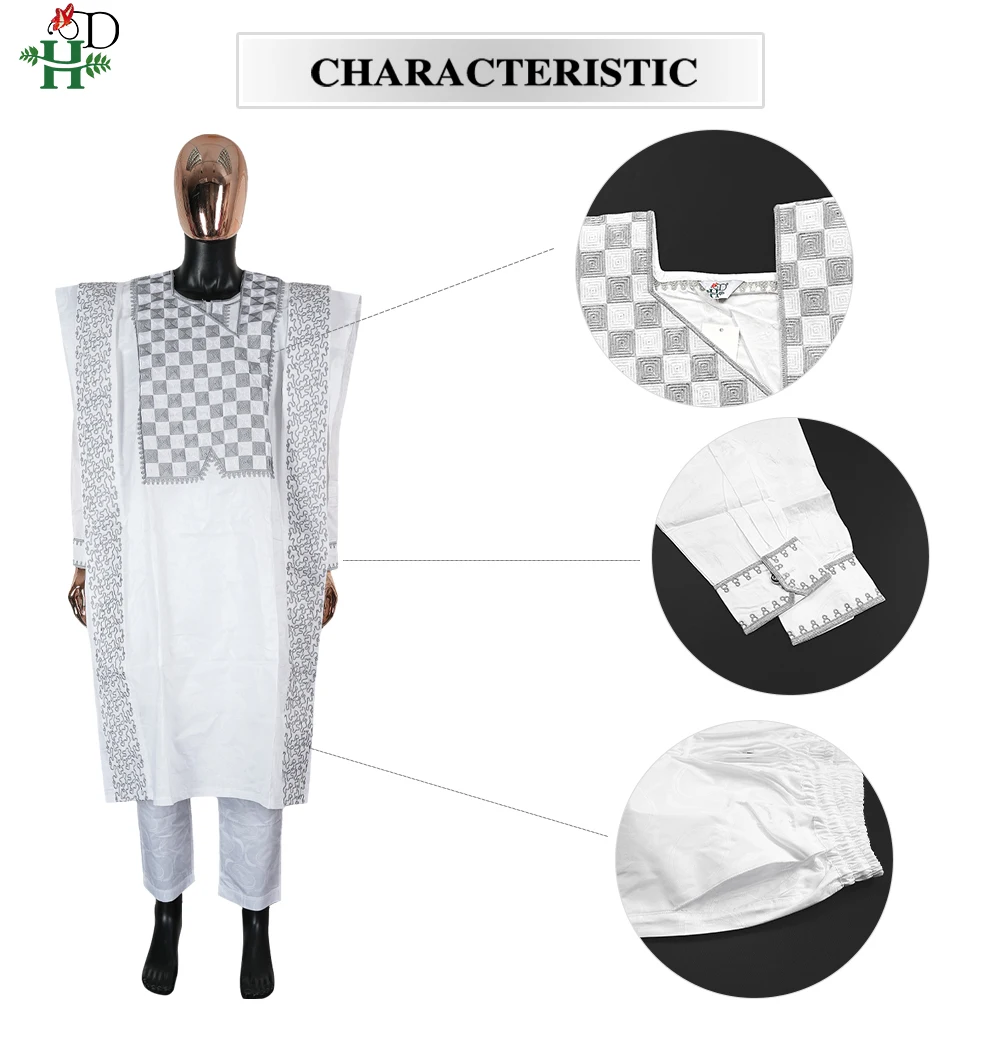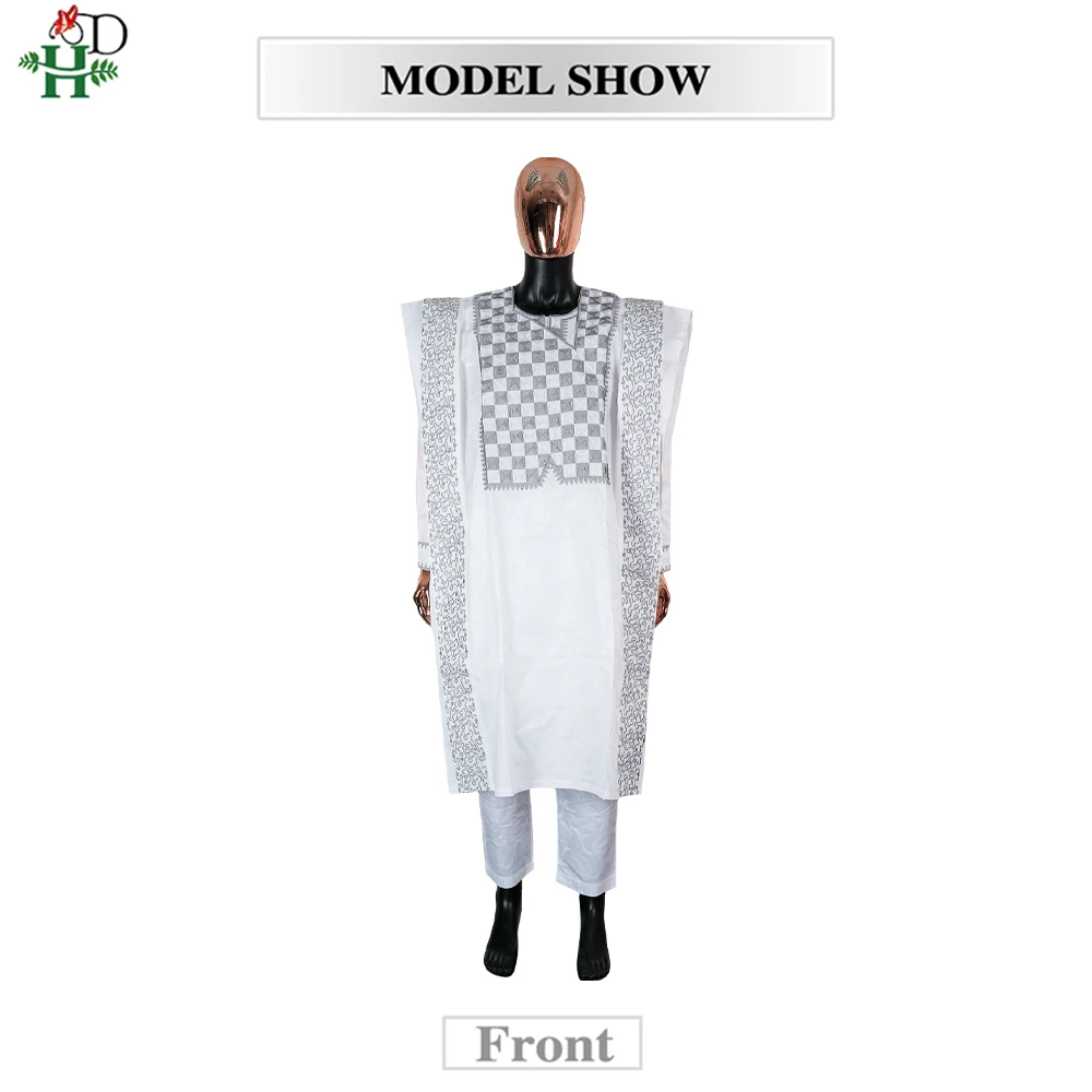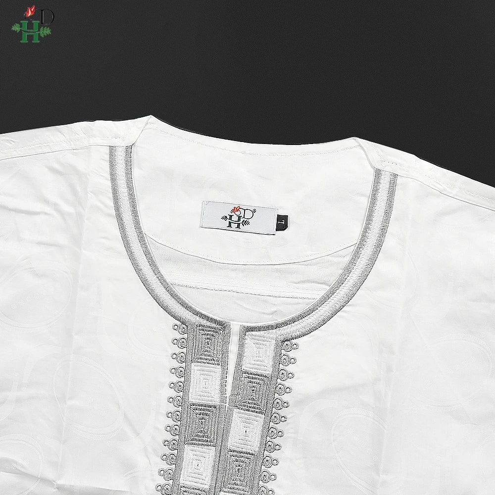 H&D New In African Summer Men's Long Sleeve Suit White Embroidery Dashiki Shirt Pants Sets 3 Pieces Outfits Wedding Party 2025