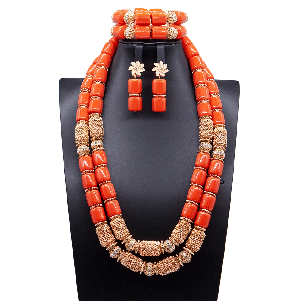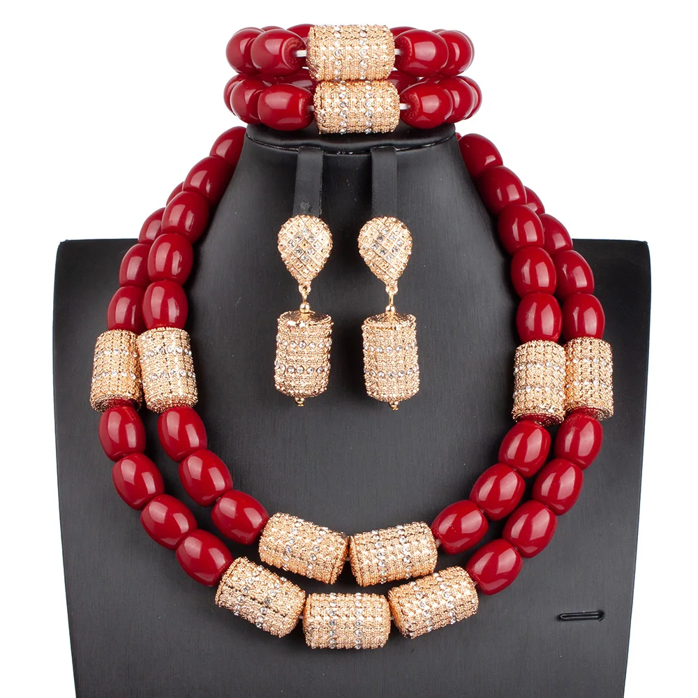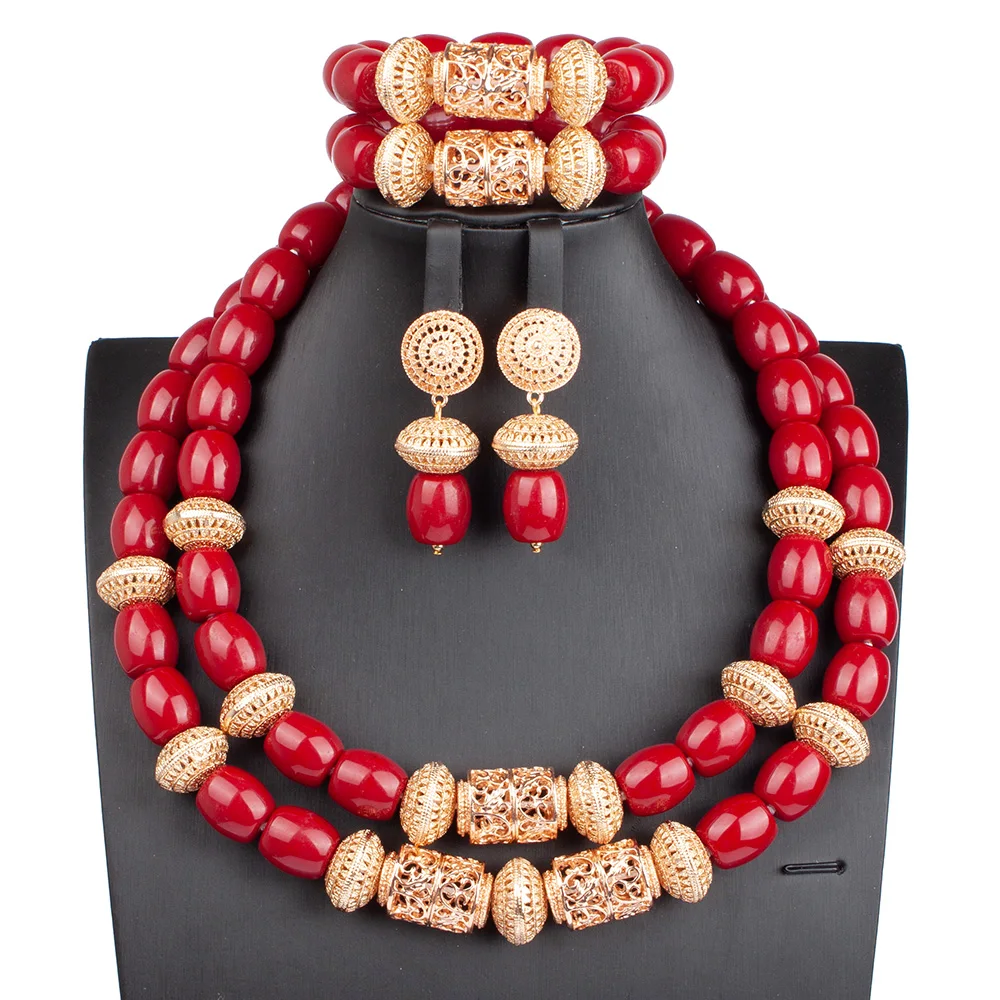 Gorgeous Red Coral Beads Wedding Sets African Nigerian Necklace Jewelry Dubai Gold Women Jewelry Set Free Shipping ABS032