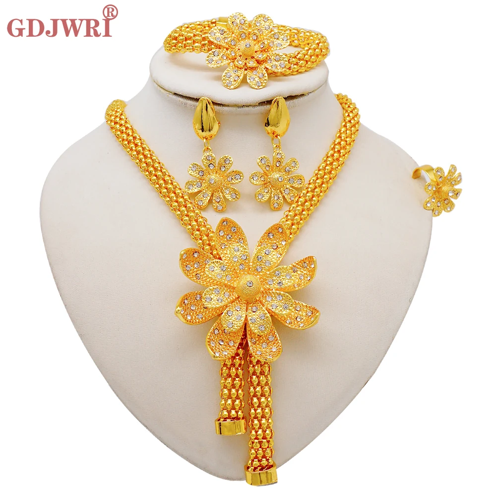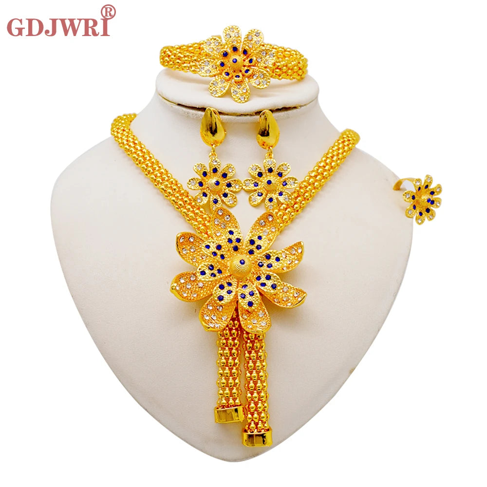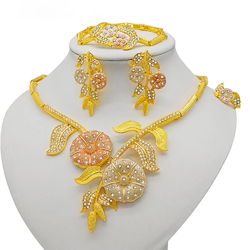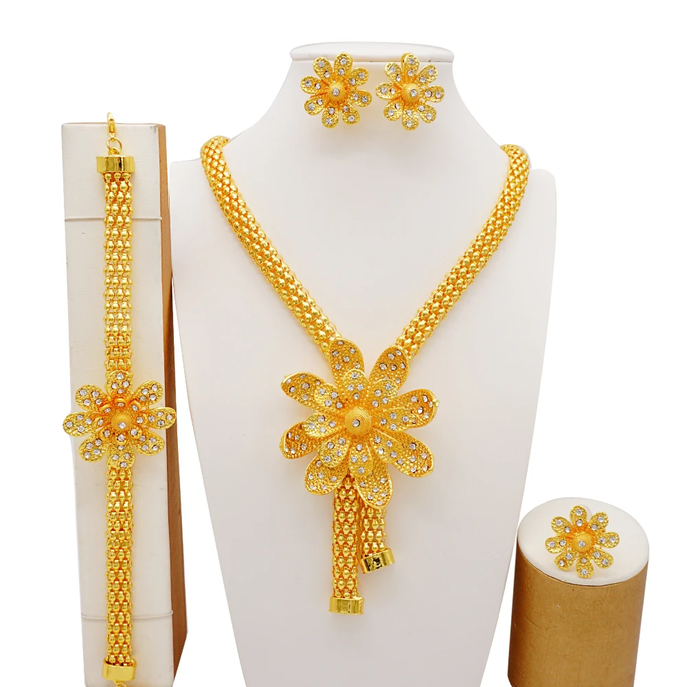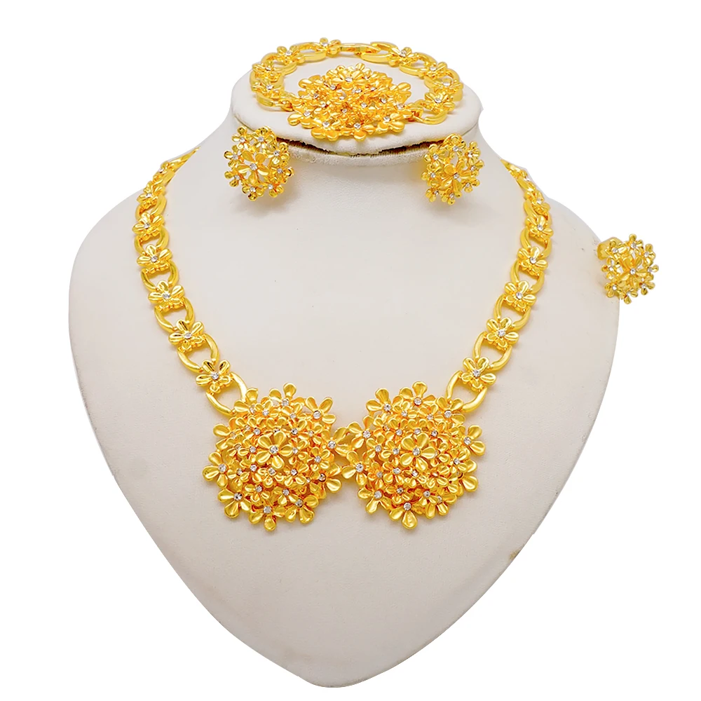 Nigeria Dubai Gold Color Fine Flowers Jewelry Sets African Wedding Gifts Party For Women Bracelet Necklace Earrings Ring Set
