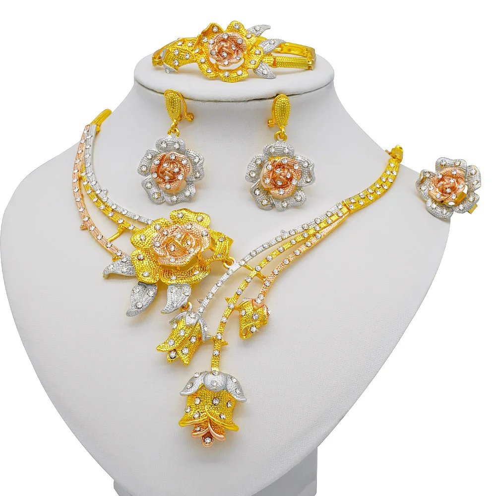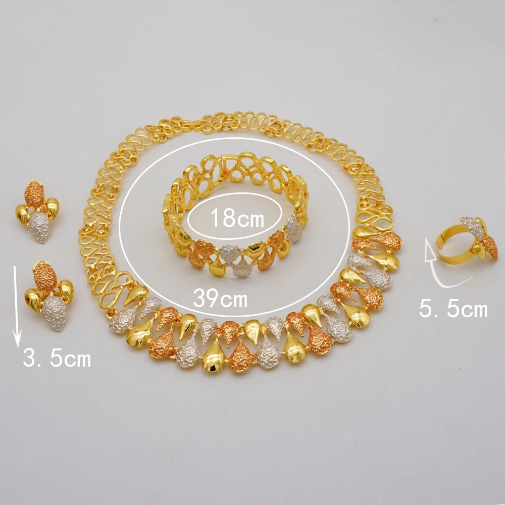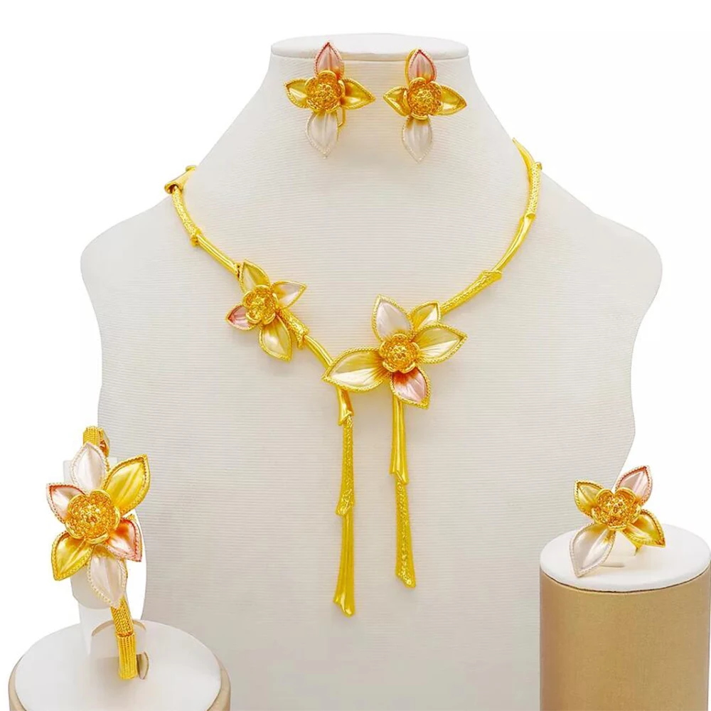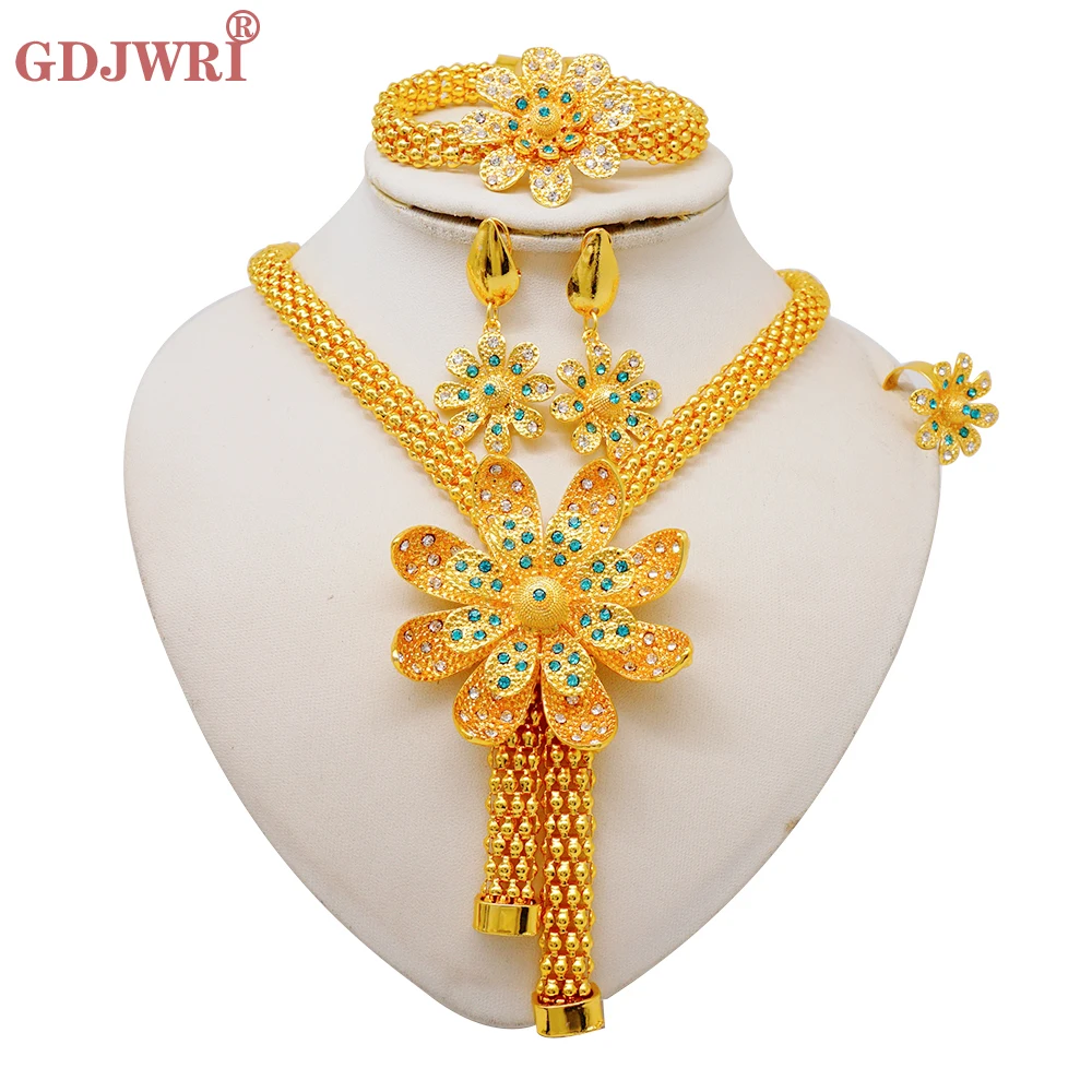 Nigeria Dubai Gold Color Fine Flowers Jewelry Sets African Wedding Gifts Party For Women Bracelet Necklace Earrings Ring Set