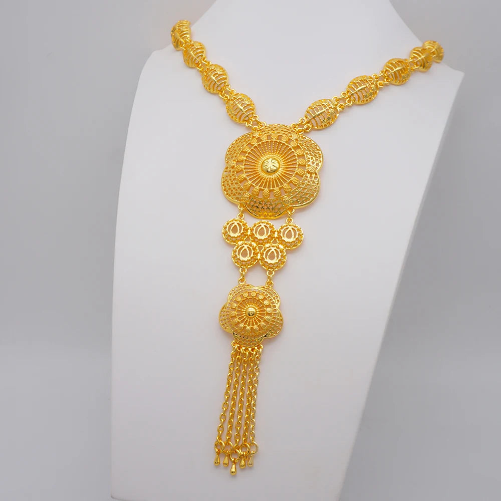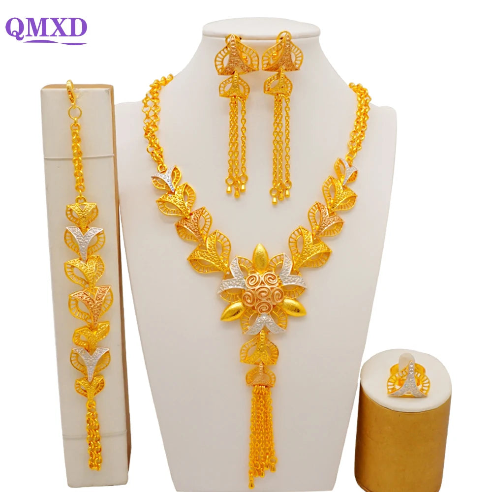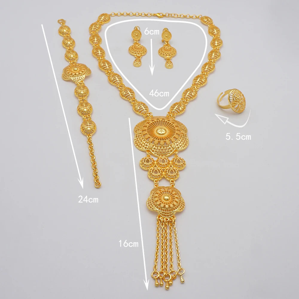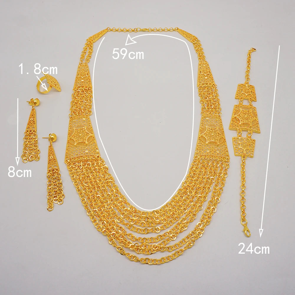 Trendy Nigerian Dubai Gold Color Jewelry Set For Women Tassel Long Chain Bridal Long Necklace Bracelet Earring Ring Wedding Sets